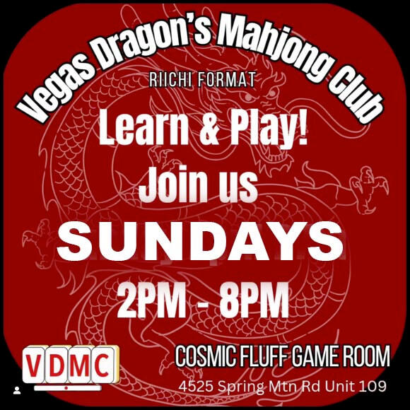 The Vegas Dragons is a Richii Mahjong Club that meets on Sundays, 2:00PM to 8:00PM at Cosmic Fluff (4525 Spring Mountain Road).Admission is FREE to watch, and $3.00 to play