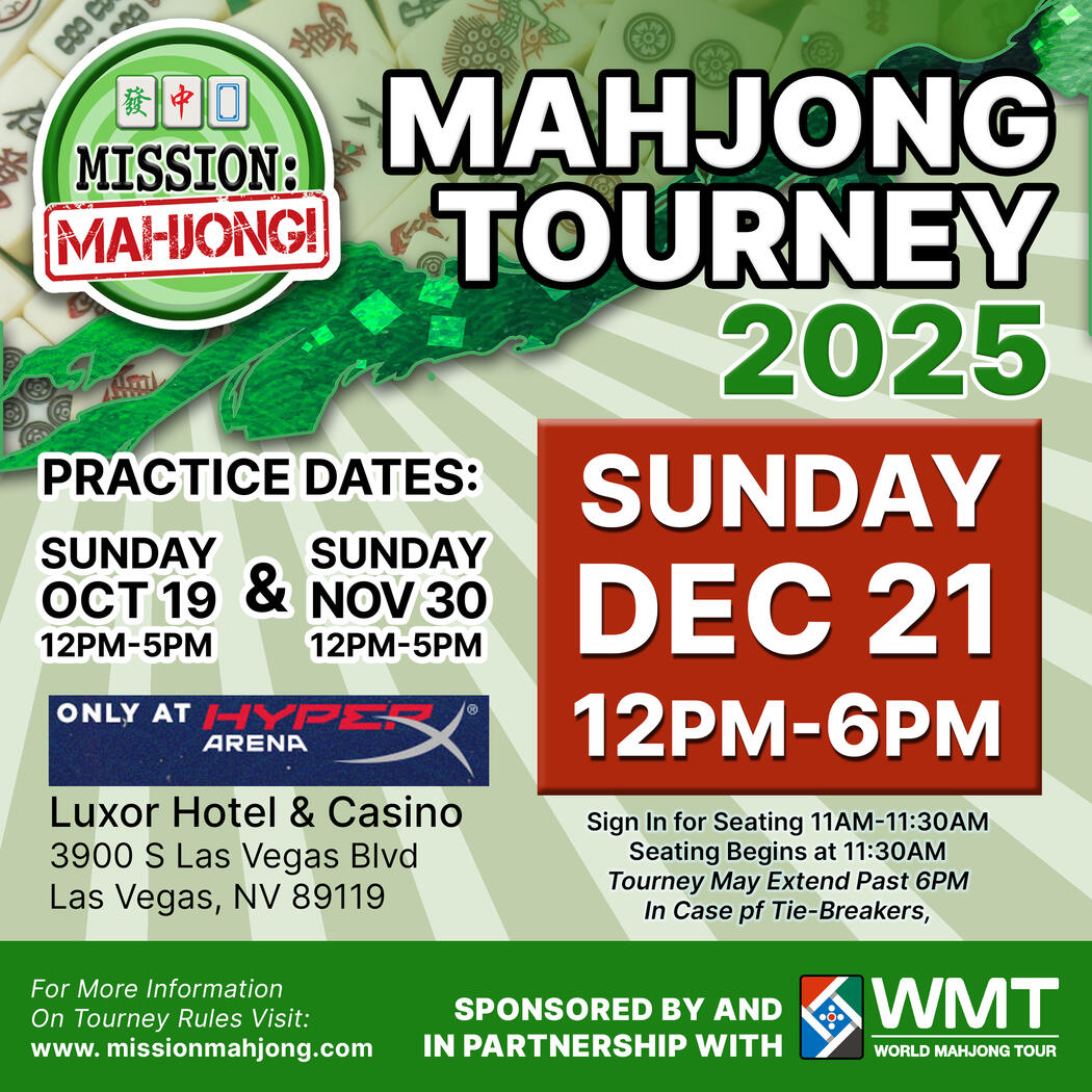 The Mission: Mahjong! Short Form Tourney will be held on Sunday, December 21st from 12PM-6PM.Check-in on the day of the tourney will be from 11:00AM-11:30AM.