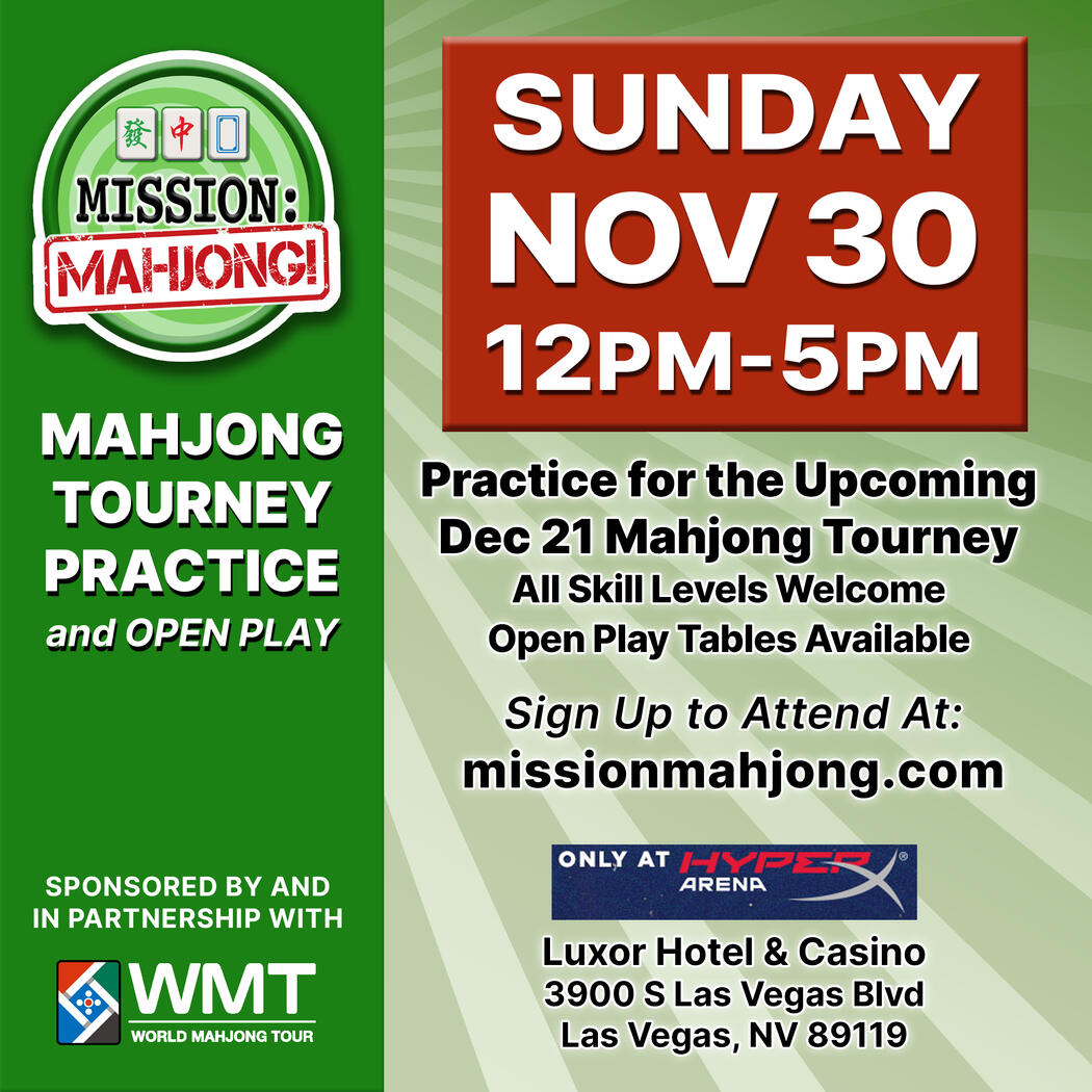 PRACTICE TO COMPETE - FREE! - In preparation for a Mission: Mahjong! Tourney at the end of this year, we'll have casual play as usual, but also offer tourney practice if you're interested in preparing for some friendly competition and cash prizes!